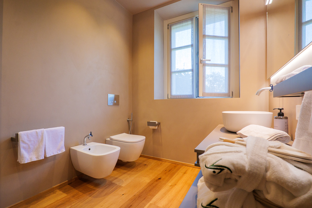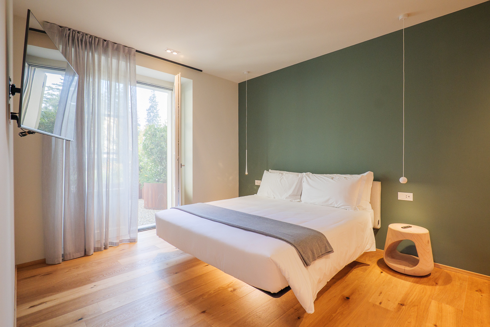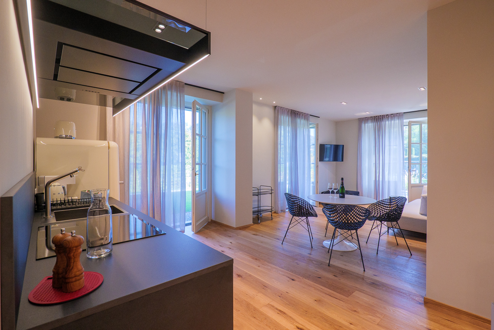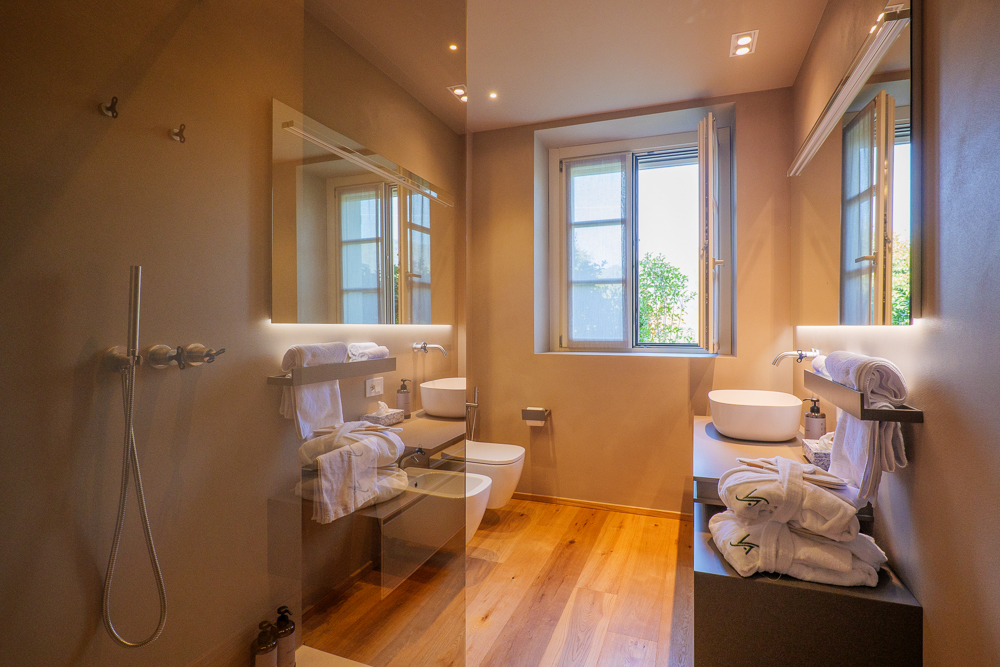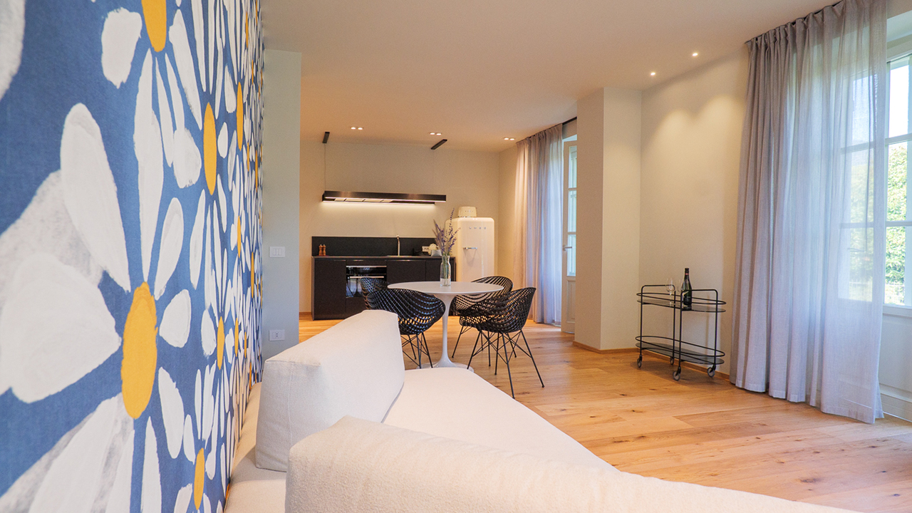 Großzügige Erdgeschosswohnung mit privatem Garten. Hell und luftig, mit Panoramablick auf den Gemeinschaftsgarten und die Villa Crespi. Sie besteht aus einem Wohnbereich mit Kochnische, einem Schlafzimmer mit Doppelbett und einem Badezimmer.