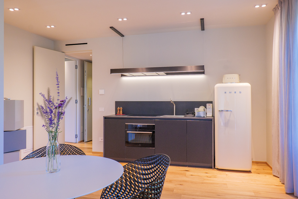 Küchenzeile mit Induktionskochfeld, Kühlschrank mit Gefrierfach, Mikrowelle, Geschirrspüler, Geschirr und Geschirrtuch